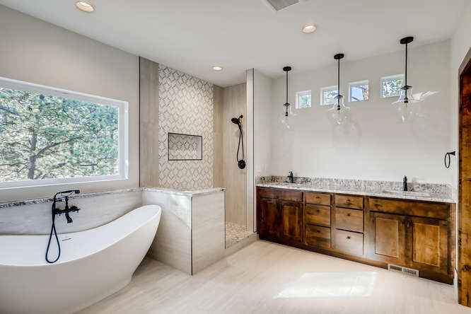 This home includes upgrades to the interior paint selection, kitchen cabinetry and layout, quartz countertops, custom dining room light fixture and raw edge floating shelves in the living entertainment area, a large 5 piece upgraded primary bathroom with custom tile and drop pendant lighting.